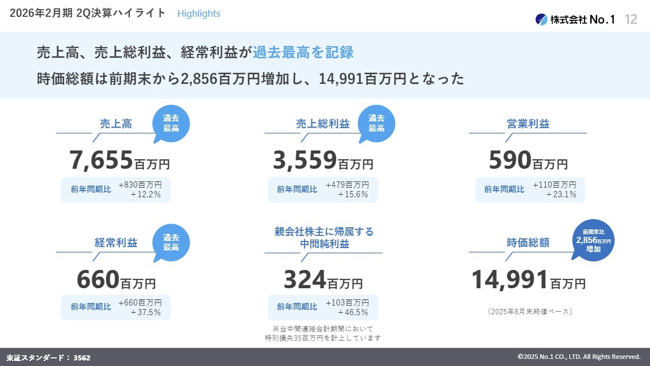 辰巳:直近の業績である2026年2月期第2四半期の決算ハイライトについてご説明します。売上高、売上総利益、営業利益、経常利益、中間純利益、直近の時価総額はスライドに記載のとおりです。