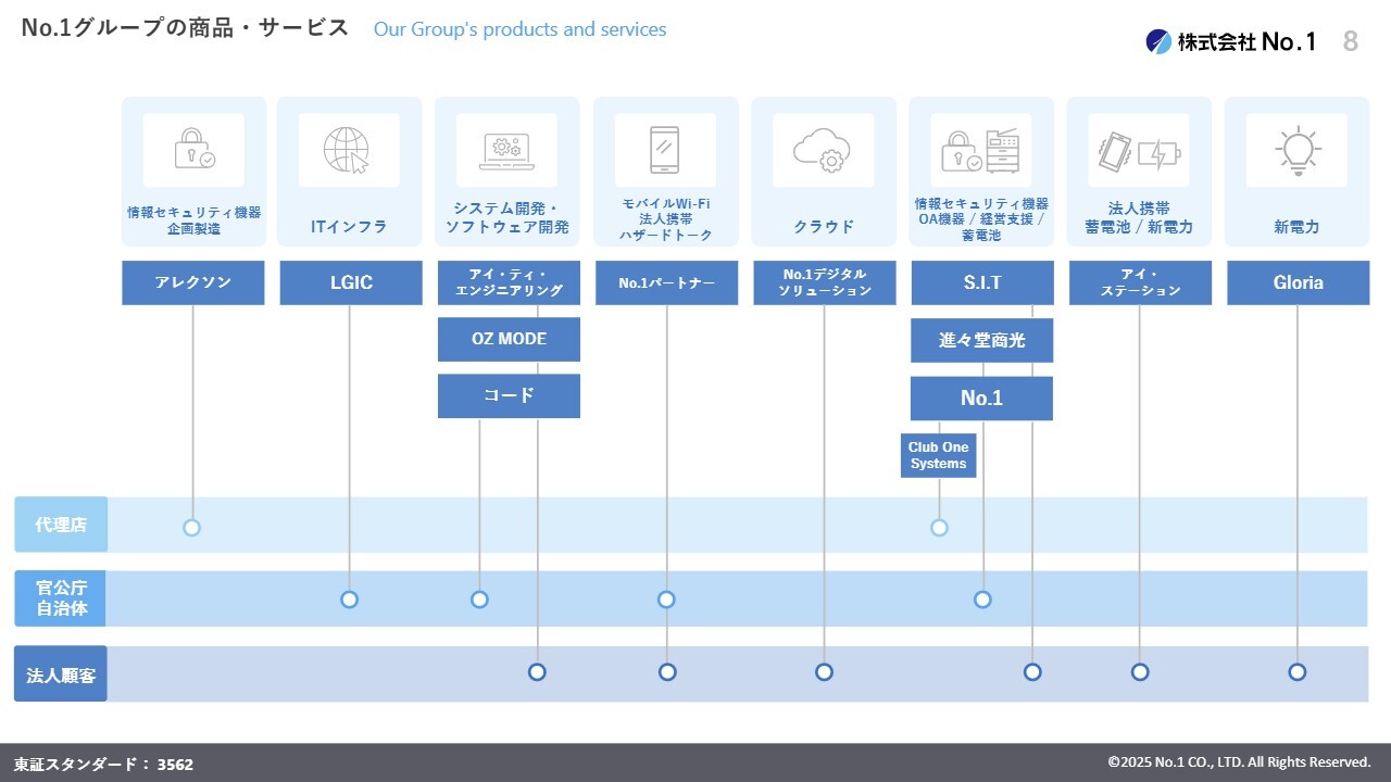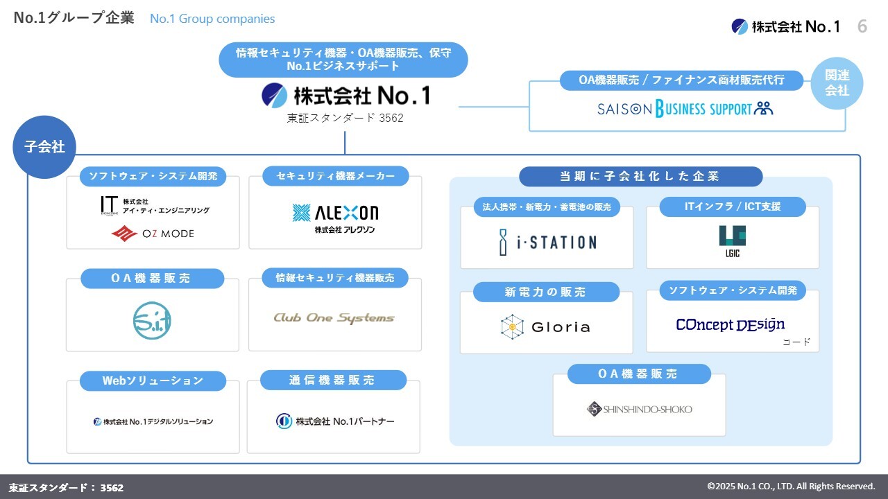 辰巳:スライドは、現在のNo.1グループの一覧です。まず、当社を中核に情報セキュリティ機器メーカーのアレクソン、ソフトウェア・システム開発を行うアイ・ティ・エンジニアリングやOZ MODEなどがあります。