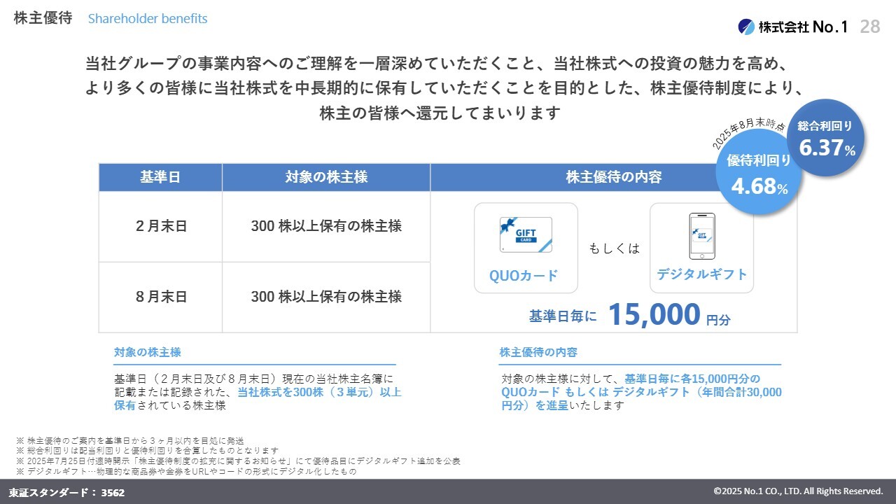 辰巳:株主優待制度についてです。7月に株主優待制度の拡充を行いました。2月末・8月末時点で300株以上保有している株主さまを対象に、年間3万円の「QUOカード」を進呈していましたが、デジタルギフトも選択可能となりました。