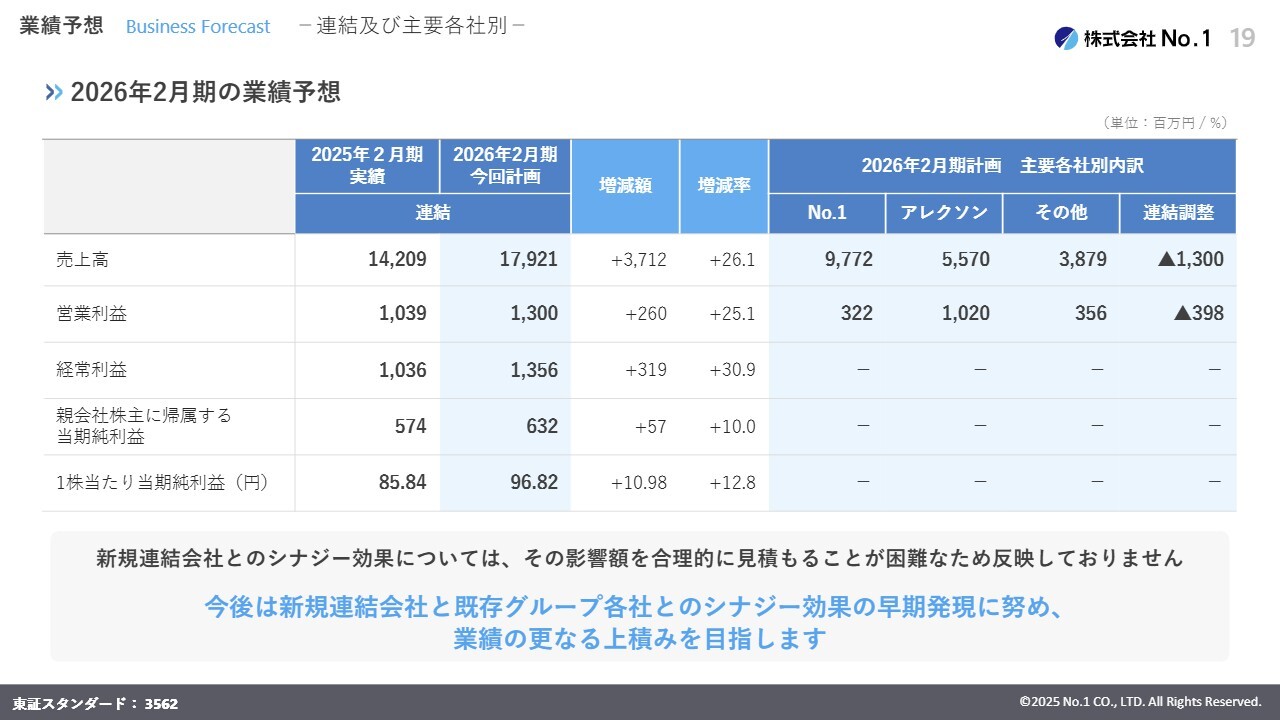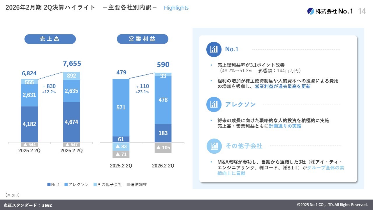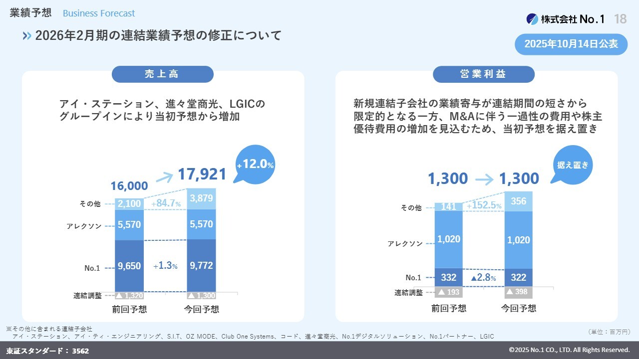 No.1、売上高・売上総利益・経常利益が過去最高、通期売上予想上方修正 M&Aによるシナジーでさらなる業績上積みへ