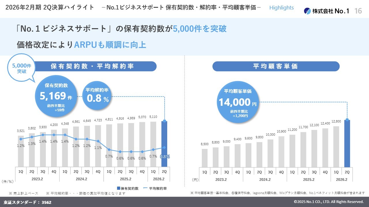 2026年2月期 2Q決算ハイライト -No.1ビジネスサポート 保有契約数・解約率・平均顧客単価-