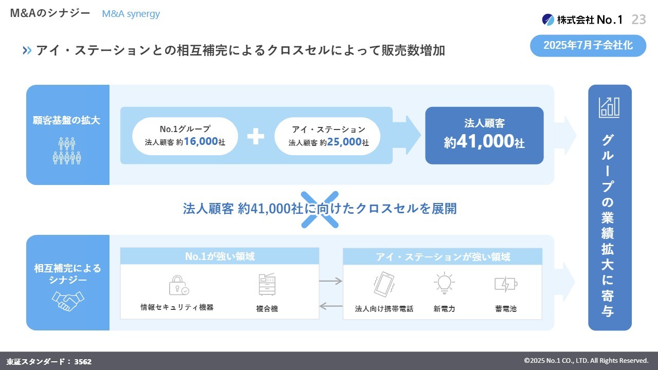 辰巳:2つ目は、顧客基盤の拡大とクロスセルです。この7月にグループに加わったアイ・ステーションは、すでに約2万5,000社の法人顧客を保有しています。これにより、グループ全体の顧客基盤は一気に約4万1,000社へと倍増しました。