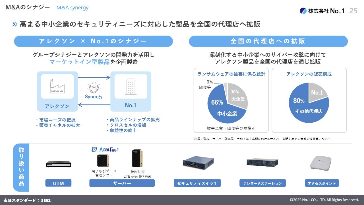 辰巳:情報セキュリティ機器メーカーであるアレクソンとのシナジーについてご説明します。当社がお客さまとの接点からニーズをキャッチアップし、メーカーであるアレクソンと迅速に連携することで、中小企業のニーズに合ったマーケットイン型の商品を展開しています。