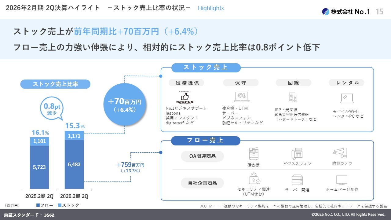 ストック売上比率が若干下がっているように見えるのは、それ以上に機器販売などのフロー売上が好調で、分母そのものが大きくなったことが要因です。事業全体の成長スピードが加速していることの表れだと認識しています。