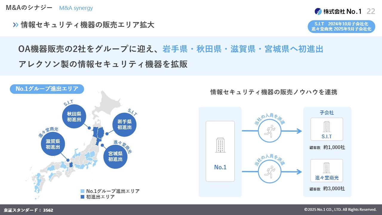 辰巳:具体的なシナジーの事例を、3つご紹介します。1つ目はエリアの拡大です。9月に子会社化した進々堂商光や、昨年グループインしたS.I.Tにより、当社グループがこれまで未進出であった岩手県、秋田県、滋賀県、宮城県へ初進出を果たしました。