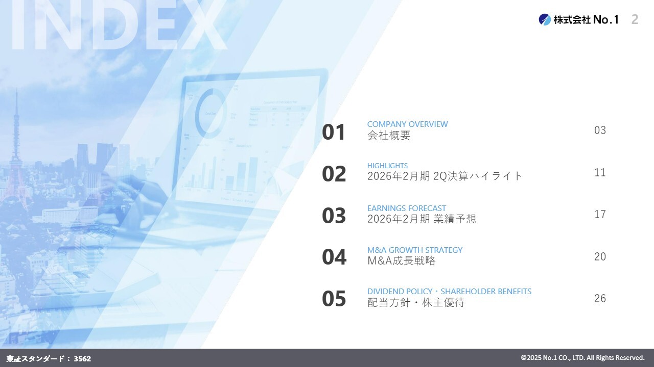 本日のインデックスです。前回の5月に続き、今回は2回目の開催ということもありますので、会社概要については要点を絞って簡潔にご説明します。直近の第2四半期決算と、前回から大きく進展したM&Aによる成長戦略の2点を中心に、当社の成長性と収益性について詳しくお話しします。