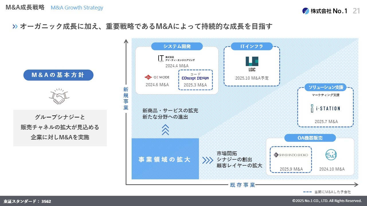当期にM&Aを実施した企業を、青い点線で囲っています。システム開発、OA機器販売、そして新たな領域であるITインフラやソリューション支援へと、事業ポートフォリオを急速に拡大・強化しています。
