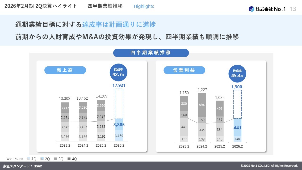 通期業績目標に対する達成率は、売上高が42.7パーセント、営業利益が45.4パーセントとなっています。当社の業績は例年、下期に偏重する傾向があるため、この達成率は計画どおり順調に推移していると言えます。グラフのとおり、四半期ベースでもしっかりと利益を積み上げることができています。