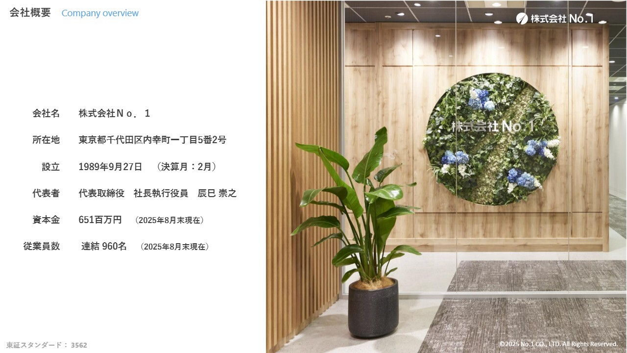 辰巳崇之氏(以下、辰巳):みなさま、こんにちは。株式会社No.1代表取締役社長執行役員の辰巳です。本日はご多用の中、当社の個人投資家向けIRセミナーをご視聴いただき、誠にありがとうございます。本日はどうぞよろしくお願いします。