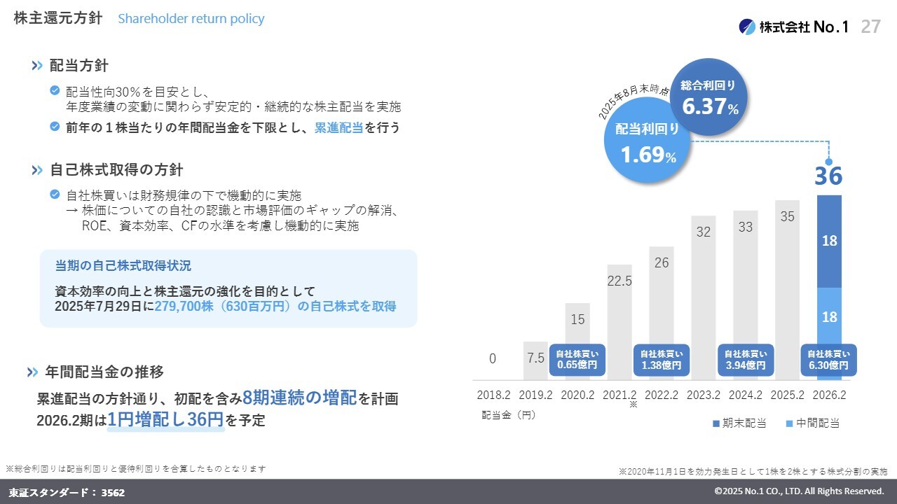 また、7月には6億3,000万円規模の自己株式を取得しました。これは発行済株式数の約5パーセントに相当する規模であり、資本効率の向上と株主還元の強化に対する、当社の強い意思表示です。