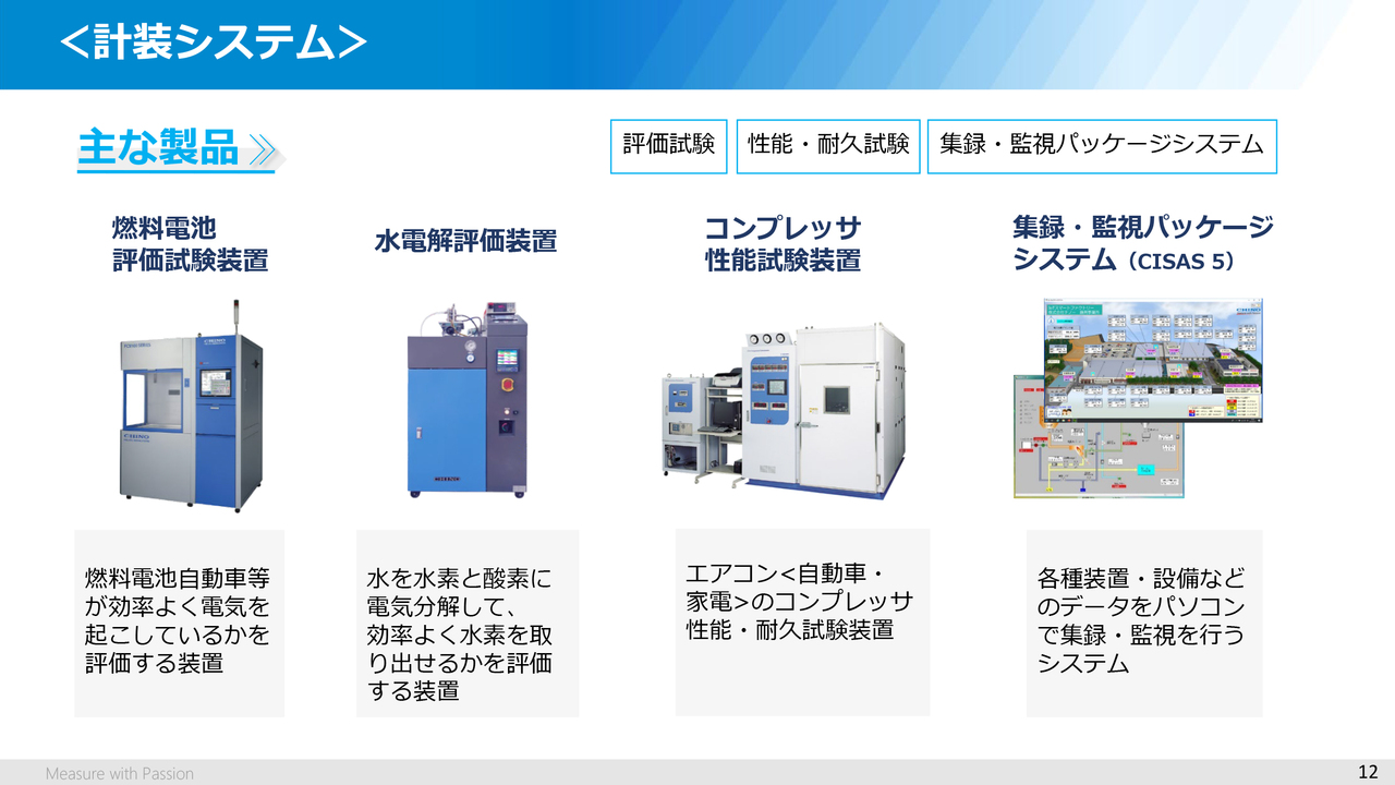 最近では、水から燃料電池で使われる水素を生成する装置を評価する水電解評価装置や、車や家電のエアコンで使われるコンプレッサの性能を試験する装置、また、ものづくりの現場における生産設備全体の温度制御や機械の稼働率、設備の異常などをモニタリングするシステムをはじめ、機器・センサなどを組み合わせてお客さま現場の課題を解決するためのシステムをご提供しています。