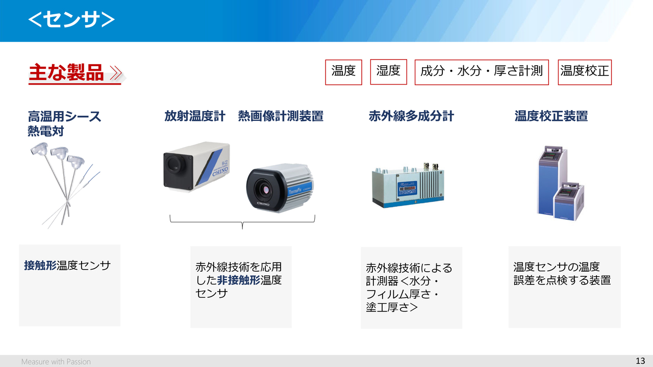 続いてセンサです。当社のセンサには、物体に接触して温度を測定するセンサと、物体から放射している赤外線エネルギーを捉えて温度に変換する非接触の放射温度計や熱を2次元で捉えて温度分布を画像化する熱画像装置(サーモグラフィ)、また赤外線によるセンシング技術を利用した水分計や成分計、その他に、湿度計、CO2濃度計、水素濃度計などがあります。