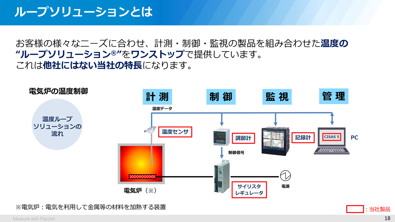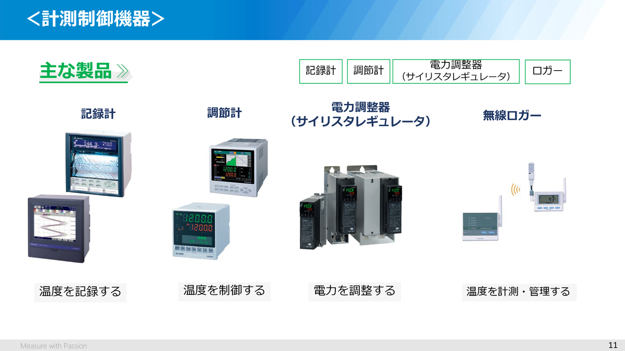 まず、計測制御機器ですが、このセグメントには、温度などを記録・監視する「記録計」、温度制御などに使われる「調節計」、調節計からの信号でヒータなどの熱源を操作する「電力調整器(サイリスタレギュレータ)」、そして温度などを収録するロガーなどのラインナップがあります。