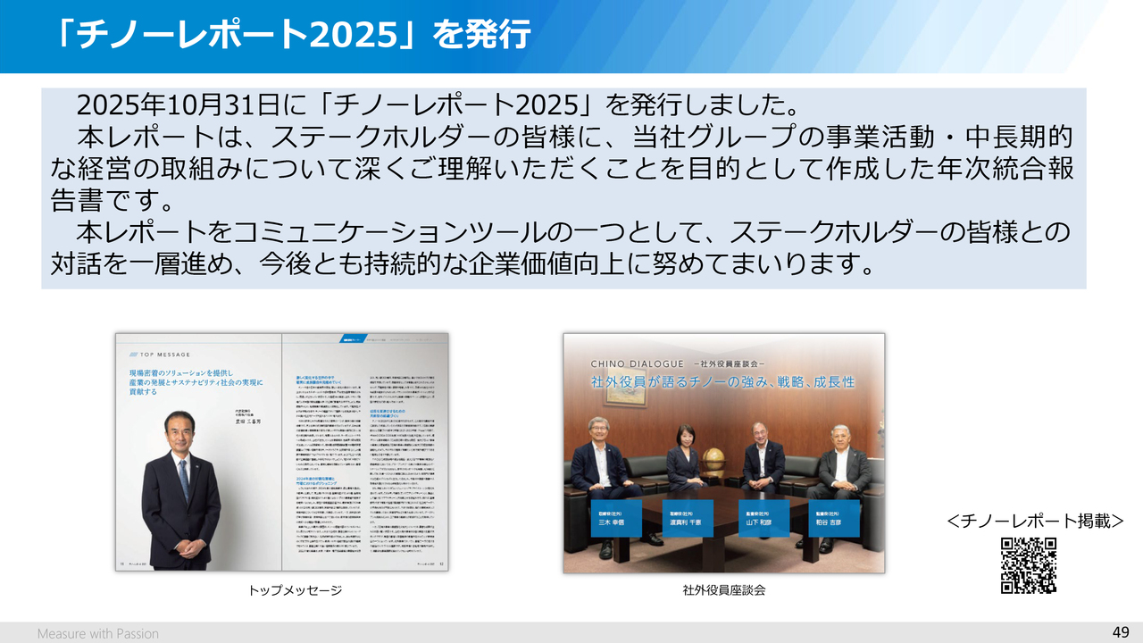 続いてのお知らせですが、2025年10月に年次統合報告書である「チノーレポート2025」を発行しました。