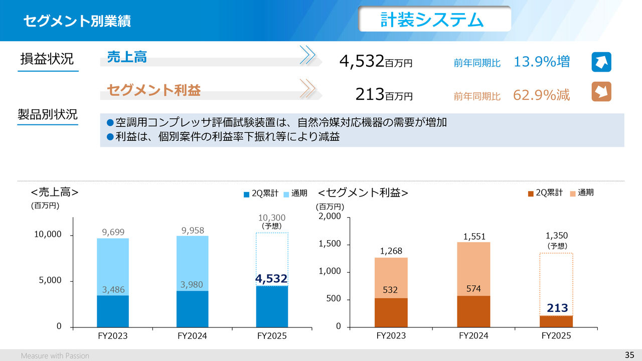次に、計装システムですが、売上高は45億3,200万円、セグメント利益は2億1,300万円と増収減益となりました。