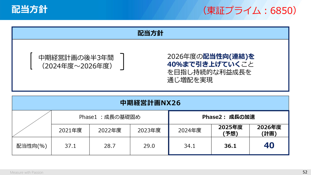 配当方針については、中計の最終年度である2026年度の配当性向を40パーセントまで引き上げていくことを目指し、持続的な利益成長を通じて増配を実現していくことを基本方針としています。