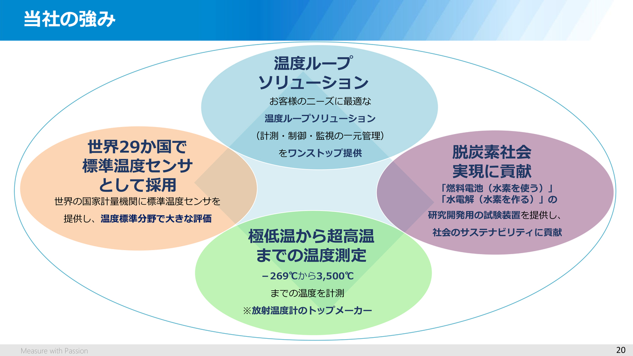 まとめると、当社の強みは、あらゆる産業で不可欠な温度管理の分野にあります。マイナス269度の極低温から3,500度の超高温まで、計測・制御・監視が可能なセンサや機器のご提供、それらを組み合わせたシステムのご提案、さらに先ほどのスライドでご紹介した標準温度センサのご提供、そして昨今のGX(グリーントランスフォーメーション)の分野では、燃料電池や水電解の研究開発用評価試験装置のご提供など、幅広い温度領域への対応力、技術力、高い信頼性が、当社の強みであると思っています。