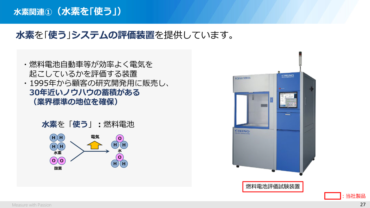 27ページです。これは、水素社会実現に貢献するシステム例で、燃料電池評価試験装置になります。