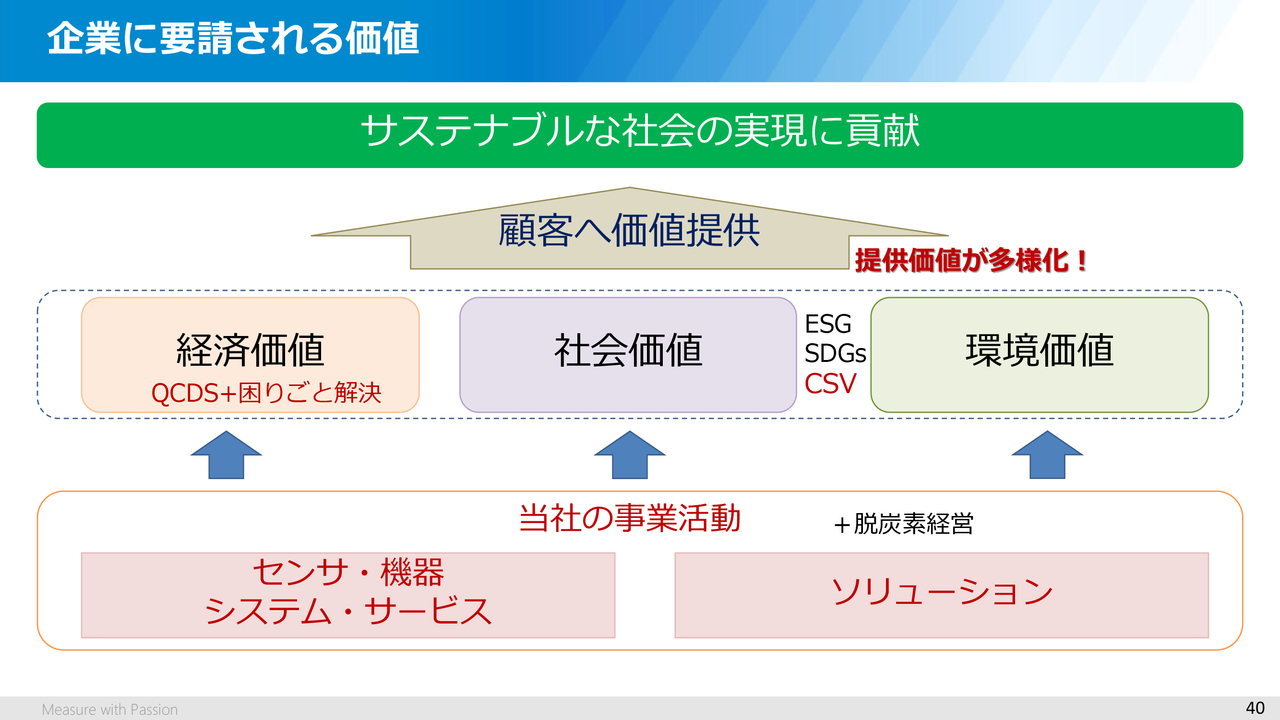 そういった変化の中でのお客さまや社会からは、経済的な価値だけでなく、社会的な価値や、環境的な価値も要請されています。