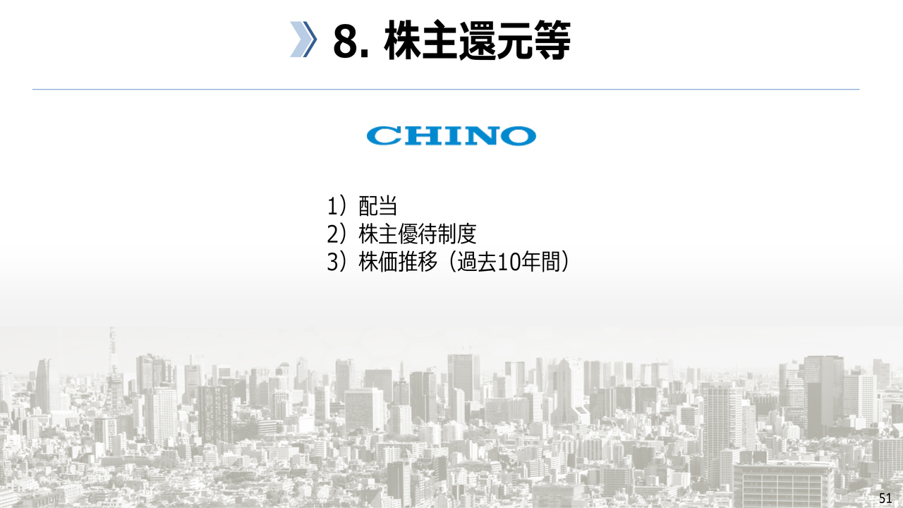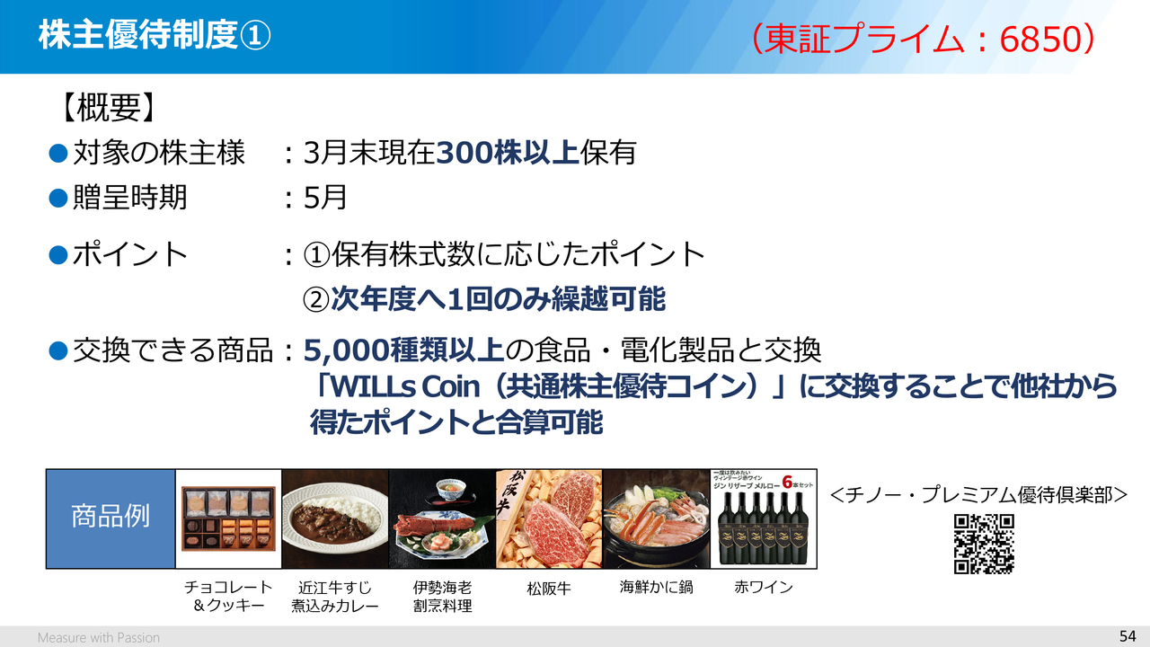 このスライドに記載のとおり、毎年3月末現在で300株以上を保有する株主さまを対象に保有株式数に応じてポイントを贈呈させていただき、Webサイト「チノー・プレミアム優待倶楽部」において、食品・電化製品等、5,000種類以上の商品と交換できるようになっています。