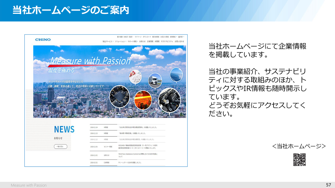 最後に当社ホームページのご案内です。ホームページには、当社の事業紹介、サステナビリティに対する取組みのほか、トピックスやIR情報も随時開示していますので、お気軽にアクセスしていただければと思います。