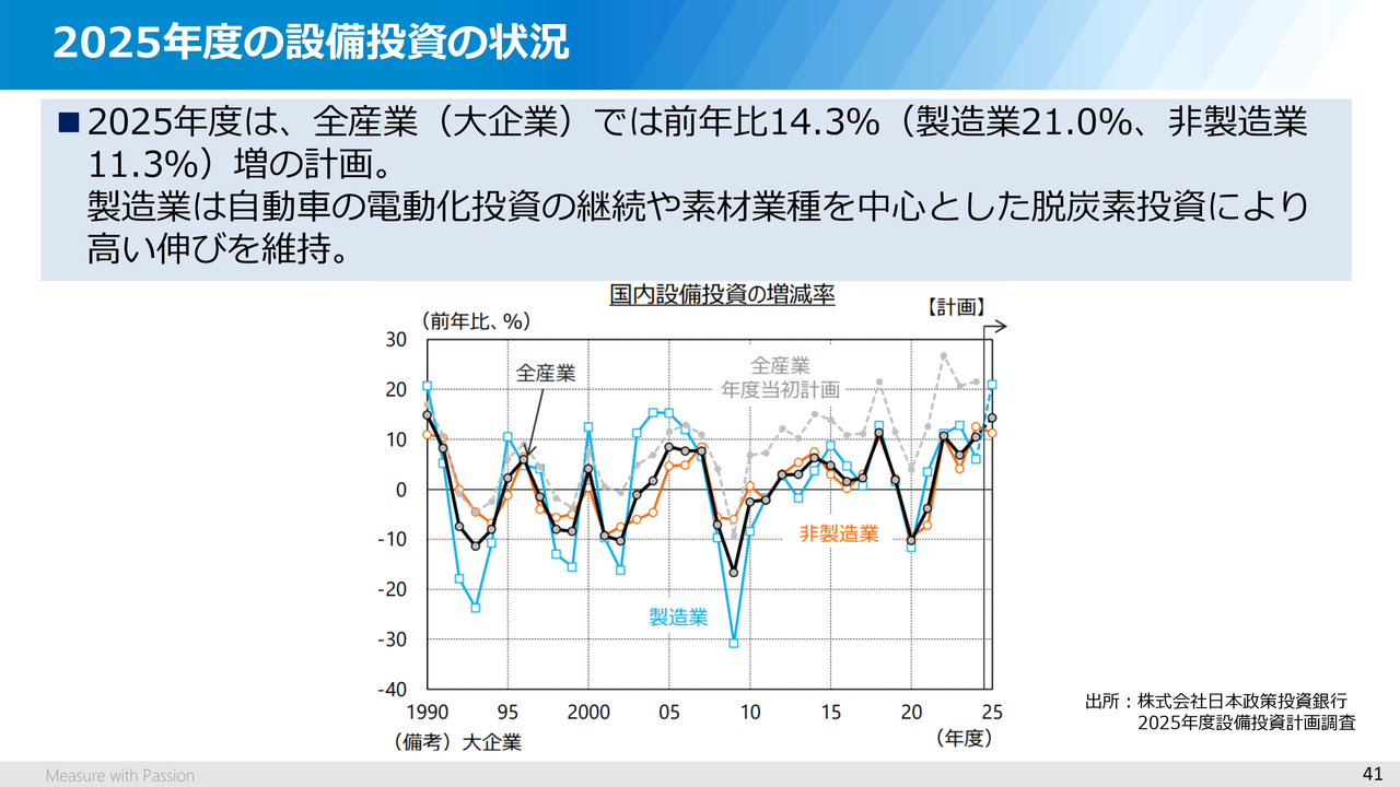 このスライドは、2025年度の設備投資の予想を示していますが、今年8月に公表された日本政策投資銀行さまの調査によると、大企業の全産業では前年比で14.3パーセント増の計画となっています。