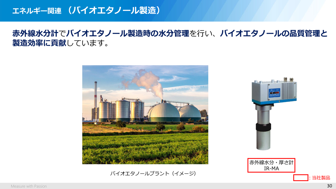 これは、バイオエタノール製造時のソリューションです。バイオエタノールは、サトウキビやトウモロコシなど、植物を原料としたカーボンニュートラルな燃料として、国内外で注目されています。
