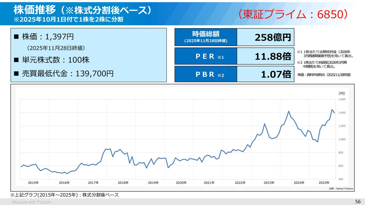 当社の株式は11月28日終値の1,397円で計算すると、時価総額は258億円でPBRは1.07倍となっています。また、11月28日の終値ベースの売買最低代金は13万9,700円となっています。