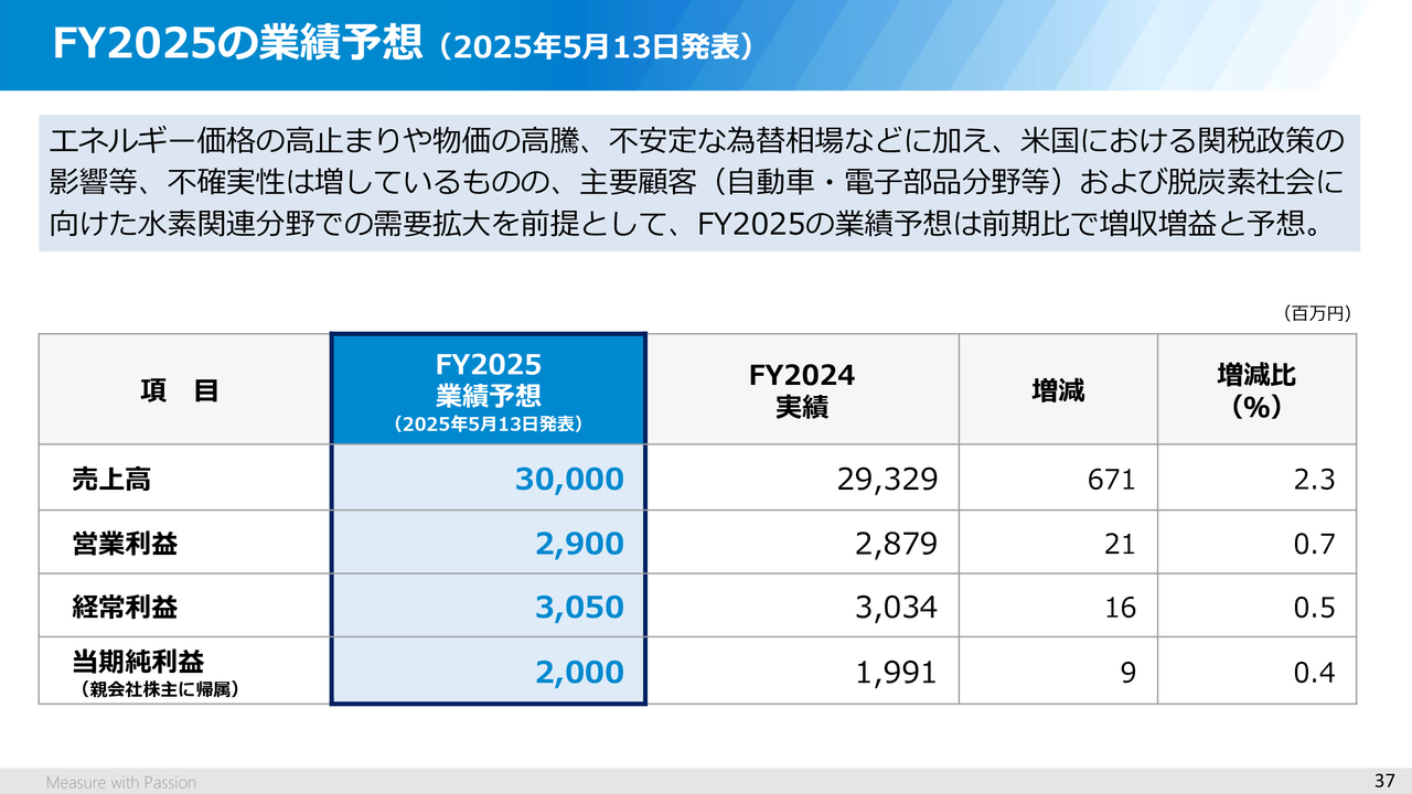次に、2025年度の業績予想についてですが、今年5月に発表した時からの変更はなく、売上高は前期比で2.3パーセントプラスの300億円、営業利益は同じく0.7パーセントプラスの29億円です。