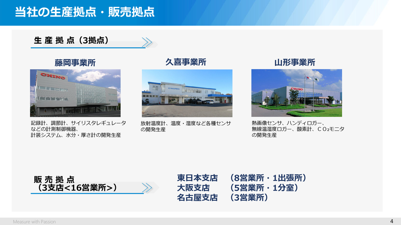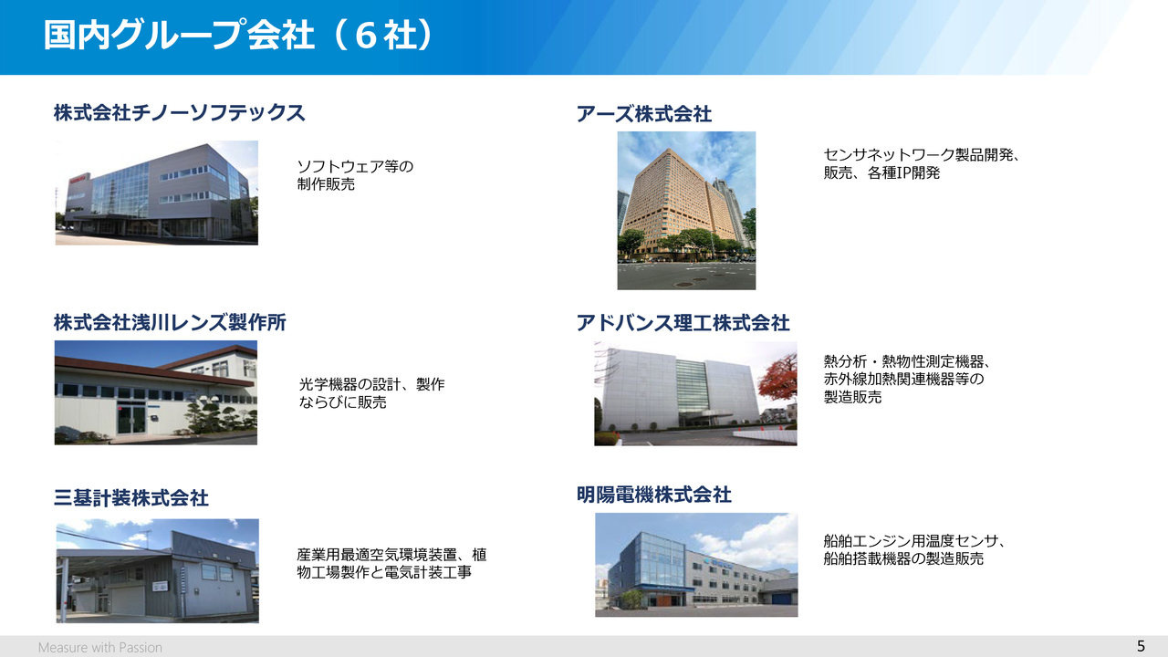 また、ご覧のように、国内には6つのグループ会社があります。左上のチノーソフテックスは当社製品の組み込みソフトウェアやPCアプリなどの開発を、またその下の浅川レンズ製作所は放射温度計用のレンズの生産などを担っています。