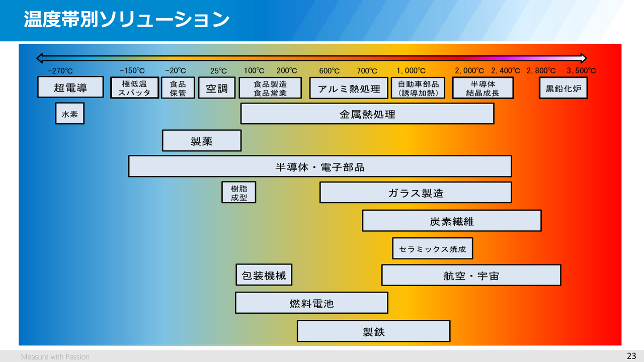 このスライドは、温度帯別に見たソリューション事例を示したものになります。ご覧のとおり、必要とされる温度帯は産業分野ごとに、かつ、お客さまごとに大きく異なります。