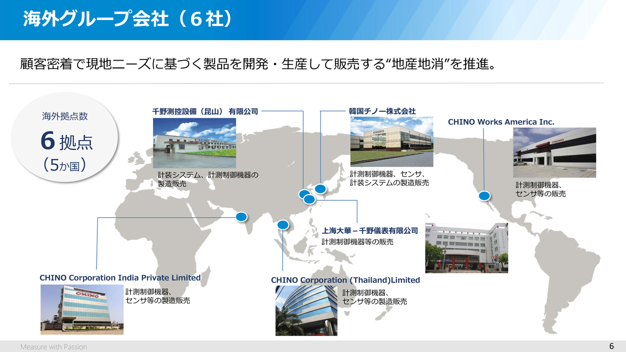 次に、海外のグループ会社ですが、このスライドにあるように中国には当社製品の販売会社と生産工場の2社の他、韓国、インド、タイ、アメリカと合計6社あります。また欧米・台湾・アセアン地域にも代理店があり、世界に向けても当社の製品や技術をお届けしています。