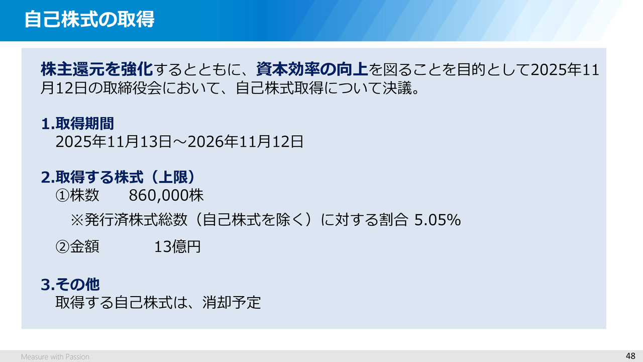 その概要ですが、取得期間は2025年11月から2026年11月の1年間で、取得する株式は、上限として株数は86万株、発行済みの株式総数の約5パーセントになります。金額は、13億円となります。また、取得する自己株式は、消却を予定しています。