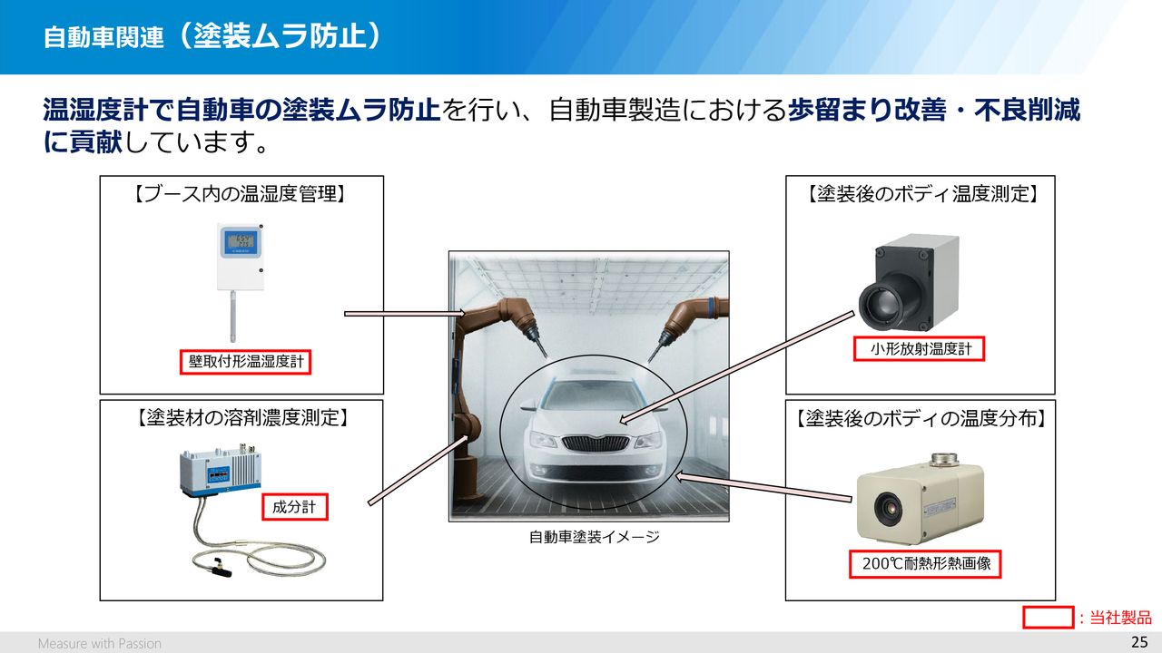 このような現場では、塗料の不均一性を防止するために、当社の赤外線を用いた成分計で、溶剤濃度をあらかじめ計測・管理して塗装したり、また、塗装中、塗装後に放射温度計や熱画像装置を用いて塗装ムラを確認したりするなど、自動車製造における歩留まり改善、不良削減に貢献しています。
