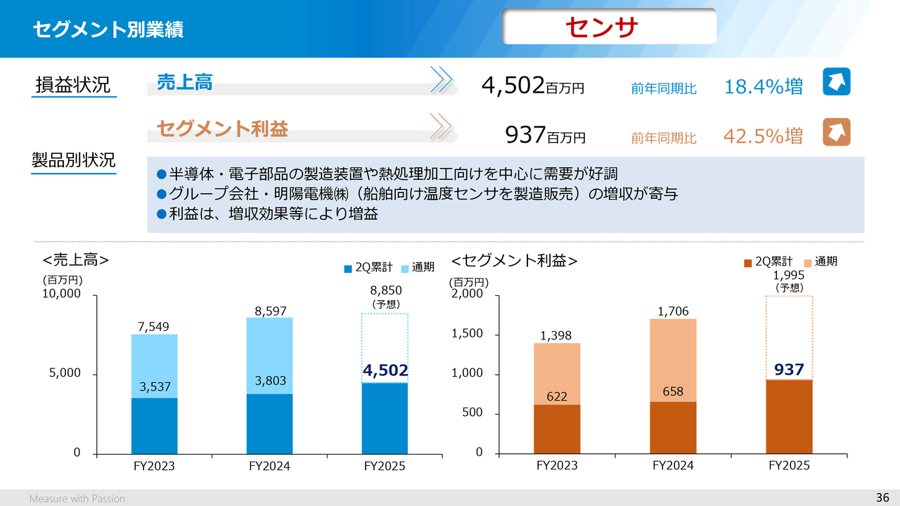 続いてセンサセグメントです。売上高は45億200万円、セグメント利益が9億3,700万円と増収増益となっています。