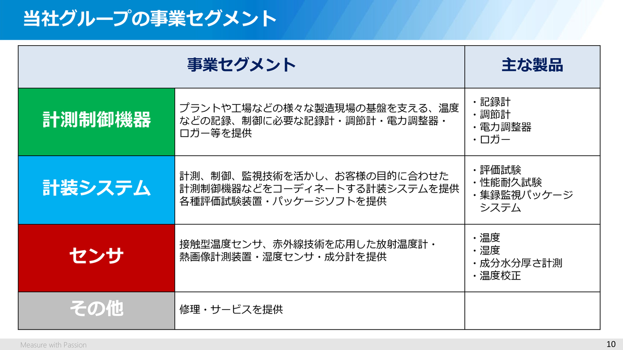 当社グループにおける事業セグメントとしては、ご覧のように計測制御機器、計装システム、センサ、その他の大きく4つに分類しています。