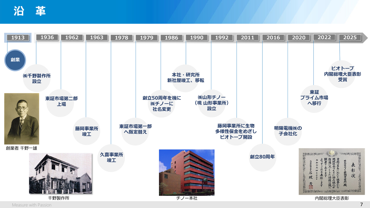 このスライドは、当社の沿革になります。冒頭にもお話ししましたが、1913年に創業し、徐々に事業を拡大しながら、今日に至っています。