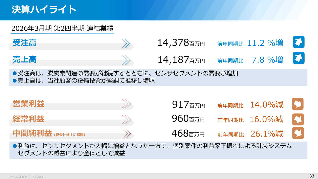 利益面については、センサセグメントが大幅に増益となった一方で、個別案件の利益率下振れによる計装システムセグメントの減益により営業利益は9億1,700万円(前年同期比14.0パーセント減)、経常利益は9億6,000万円(同16.0パーセント減)、中間純利益(親会社株主に帰属)は4億6,800万円(同26.1パーセント減)となり、増収減益となりました。