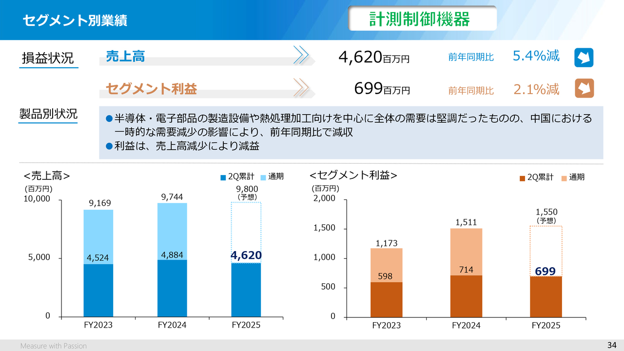 まず、計測制御機器セグメントの実績は、売上高は46億2,000万円、セグメント利益は6億9,900万円と減収減益となりました。