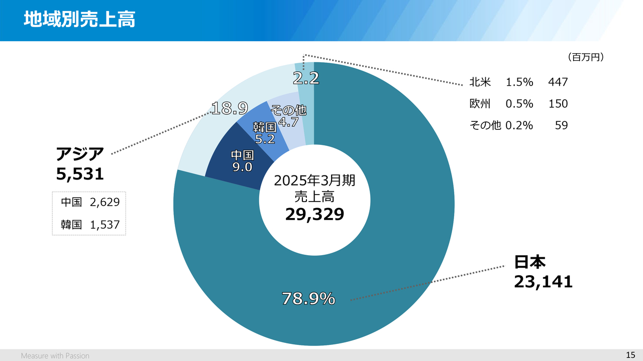 15ページの円グラフは、2024年度の地域別の売上高ですが、海外売上高は約20パーセントで、主な販売エリアは中国と韓国になっています。
