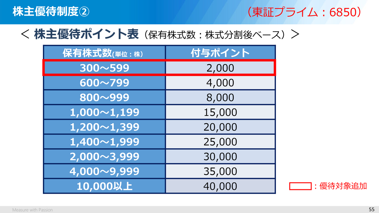 付与ポイントについては、先ほどご説明した10月1日付けの株式分割のタイミングで、株主優待制度の対象となる最少保有株式数を引き下げ、従来と比べて利用しやすい制度としました。