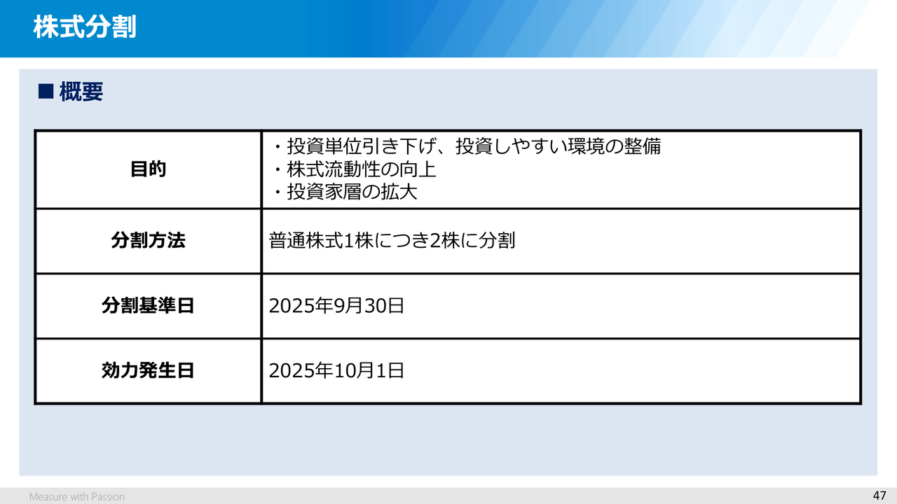 2025年4月に東京証券取引所から「株式の最低投資額」を10万円程度に引き下げる要請があったことを踏まえ、2025年10月1日付で当社は普通株式1株につき2株の割合で株式分割を行いました。