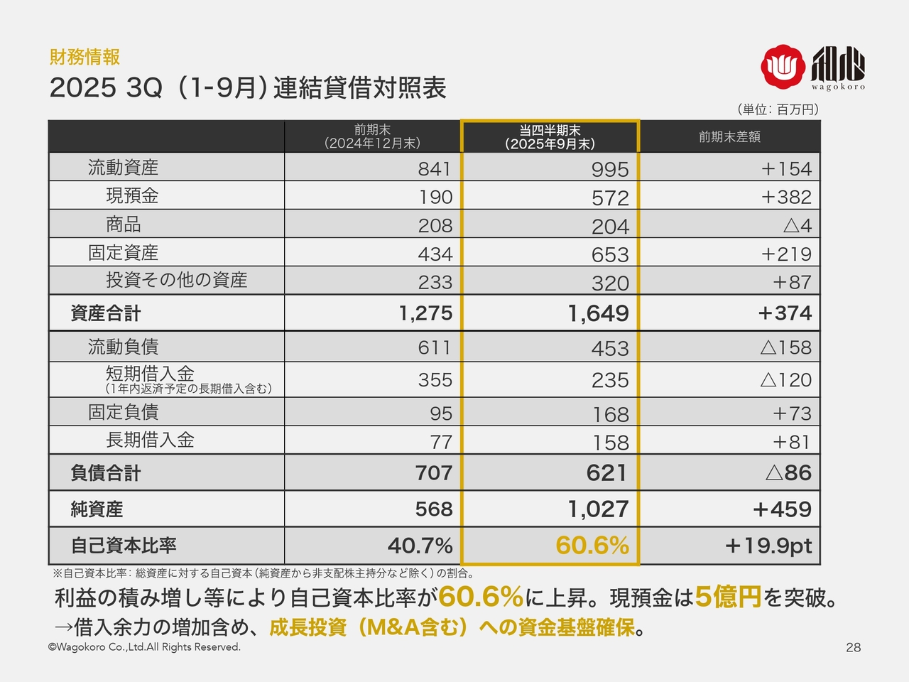 利益の積み増しにより自己資本比率は40.7パーセントから60.6パーセントへ改善し、現預金は5億円を突破しています。借入余力が向上し、M&Aを含む、今後の成長投資に必要な資金を確保できる状況となっています。