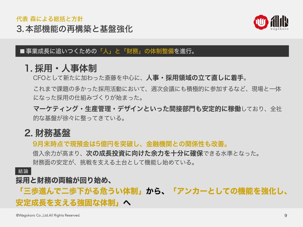 また、本部機能の再構築と基盤強化については、人材面と財務面の両面から、安定成長を支える体制へと進化しました。