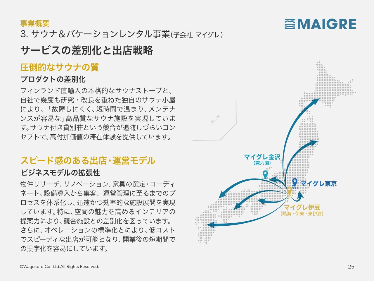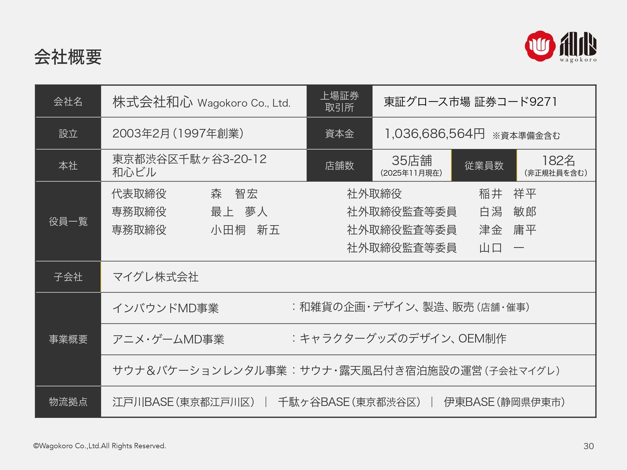 事業内容はインバウンドMD事業(和雑貨の企画・デザイン、製造、販売) 、アニメ・ゲームMD事業(キャラクターグッズのデザイン、OEM制作)、サウナ&バケーションレンタル事業(子会社マイグレによる運営) となっています。