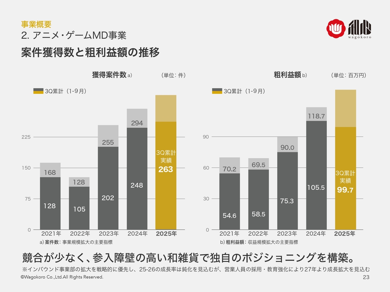 アニメ・ゲームMD事業における案件獲得数と粗利益額の推移についてご説明します。