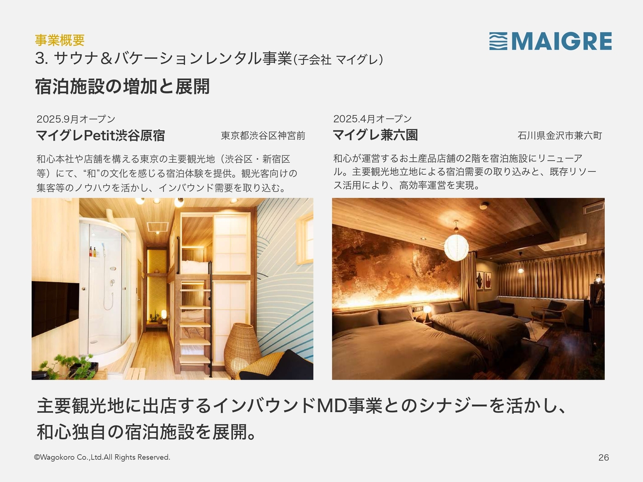2025年9月には、東京都渋谷区神宮前に「マイグレPetit渋谷原宿」がオープンしました。和心本社や店舗が所在する渋谷区・新宿区等といった主要観光地において、“和”の文化を感じられる宿泊体験を提供し、観光客向けの集客等のノウハウを活かしてインバウンド需要を取り込んでいます。