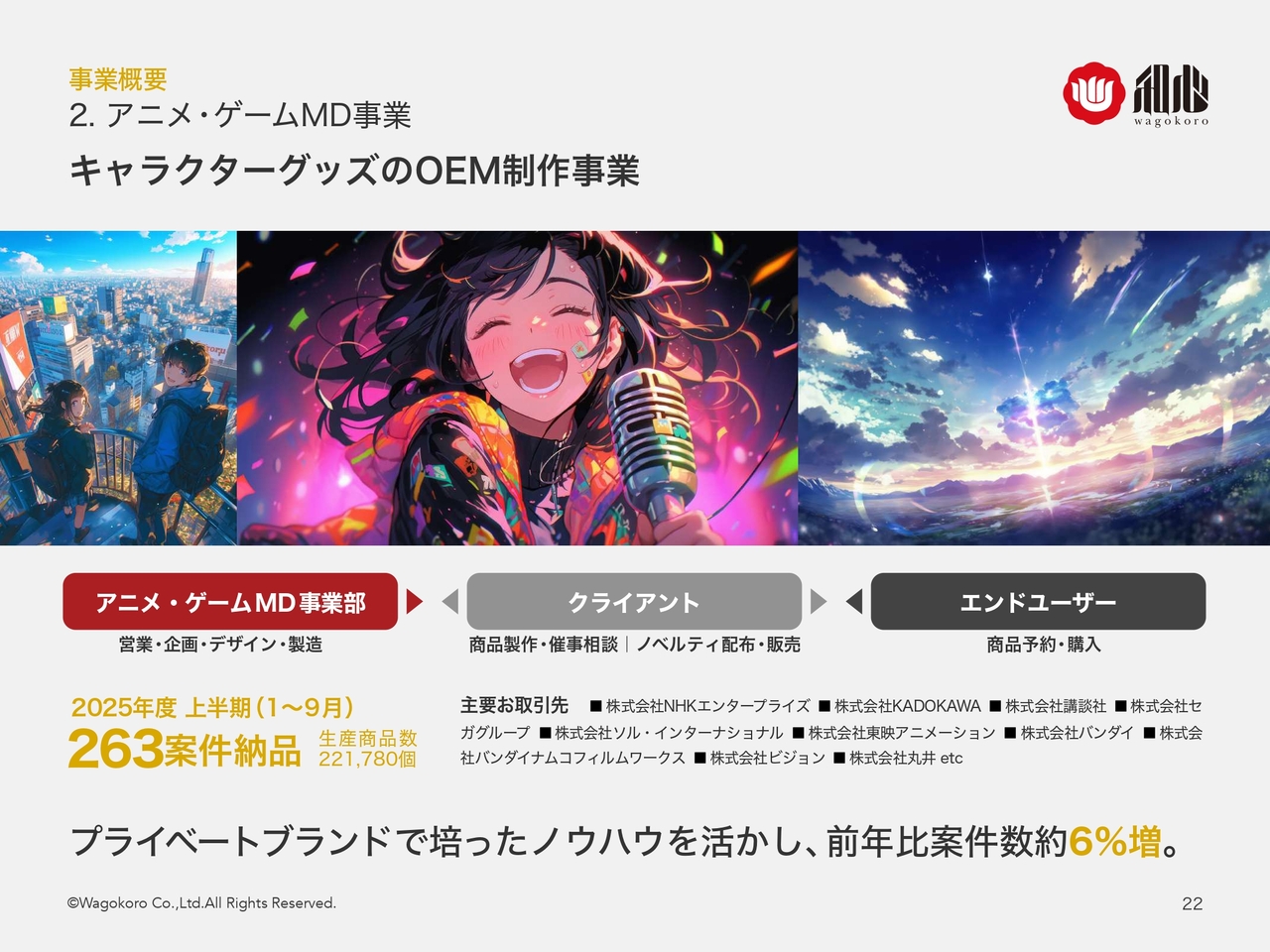 2025年度上半期(1月から9月)の実績として263案件納品しています。生産商品数は22万1,780個になります。
