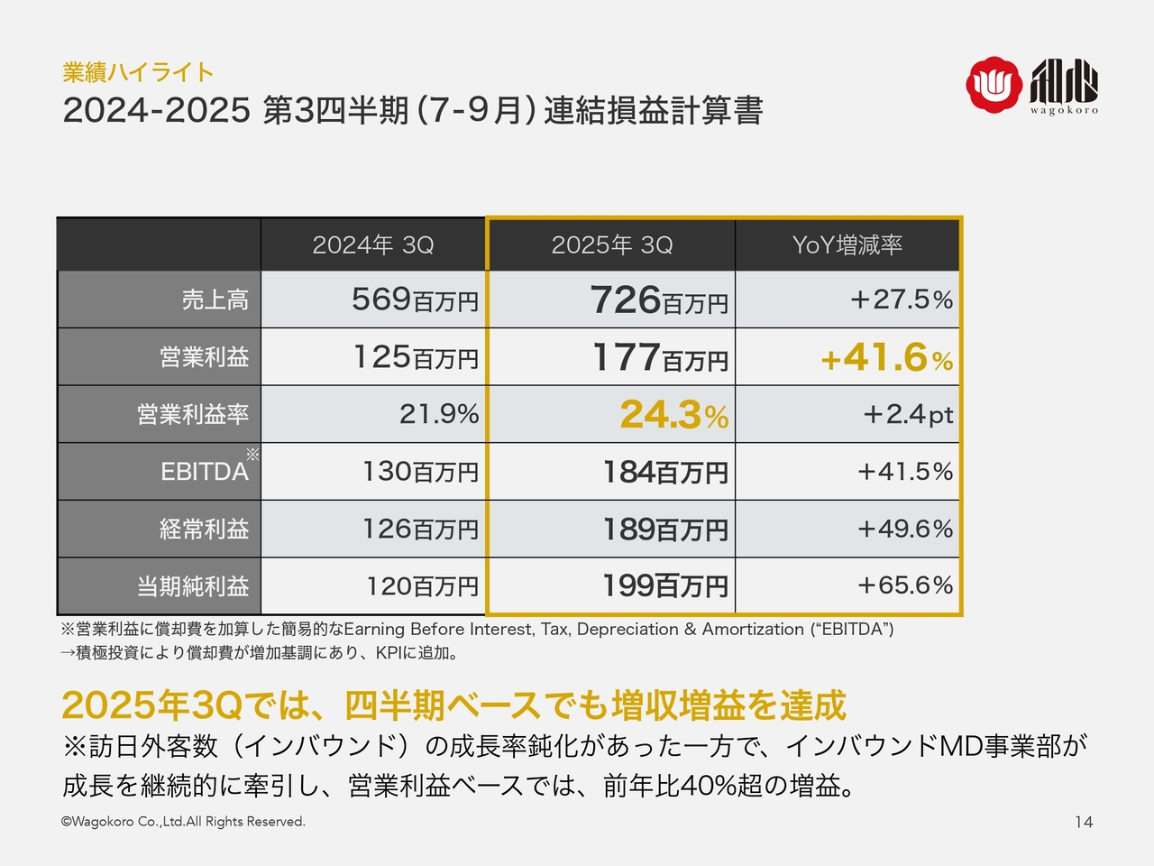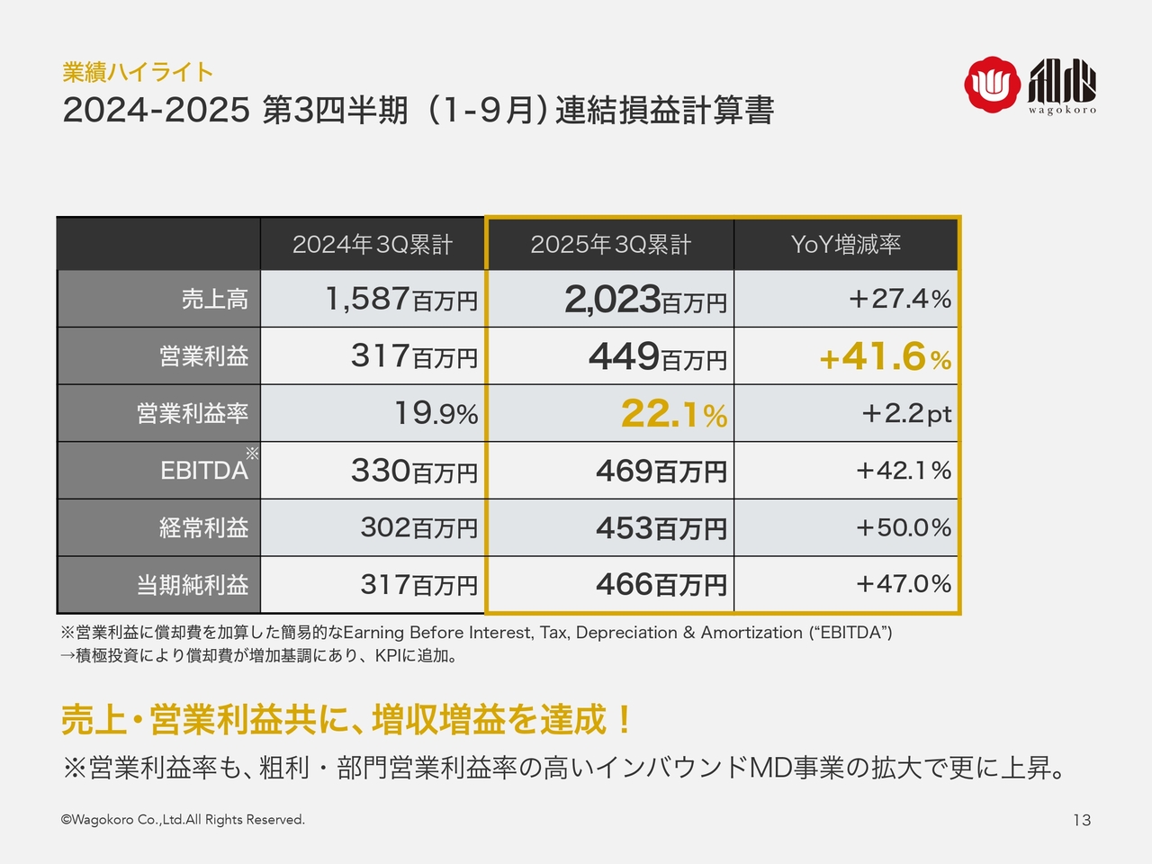 EBITDAは3億3,000万円から4億6,900万円へ増加し、前年同期比42.1パーセント増となりました。積極投資に伴う償却費の増加基調から、EBITDAは新たにKPIとして追加されています。