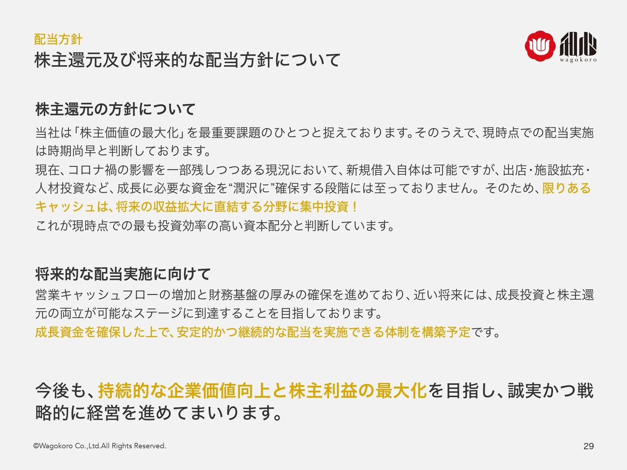 現在、コロナ禍の影響が一部残っています。新規借入は可能なものの、出店、施設拡充、人材投資など、成長に必要な資金を十分に確保する段階には至っていません。そのため、限られたキャッシュは将来の収益拡大に直結する分野に集中投資していく方針です。これが現時点で最も投資効率の高い資本配分だと考えています。